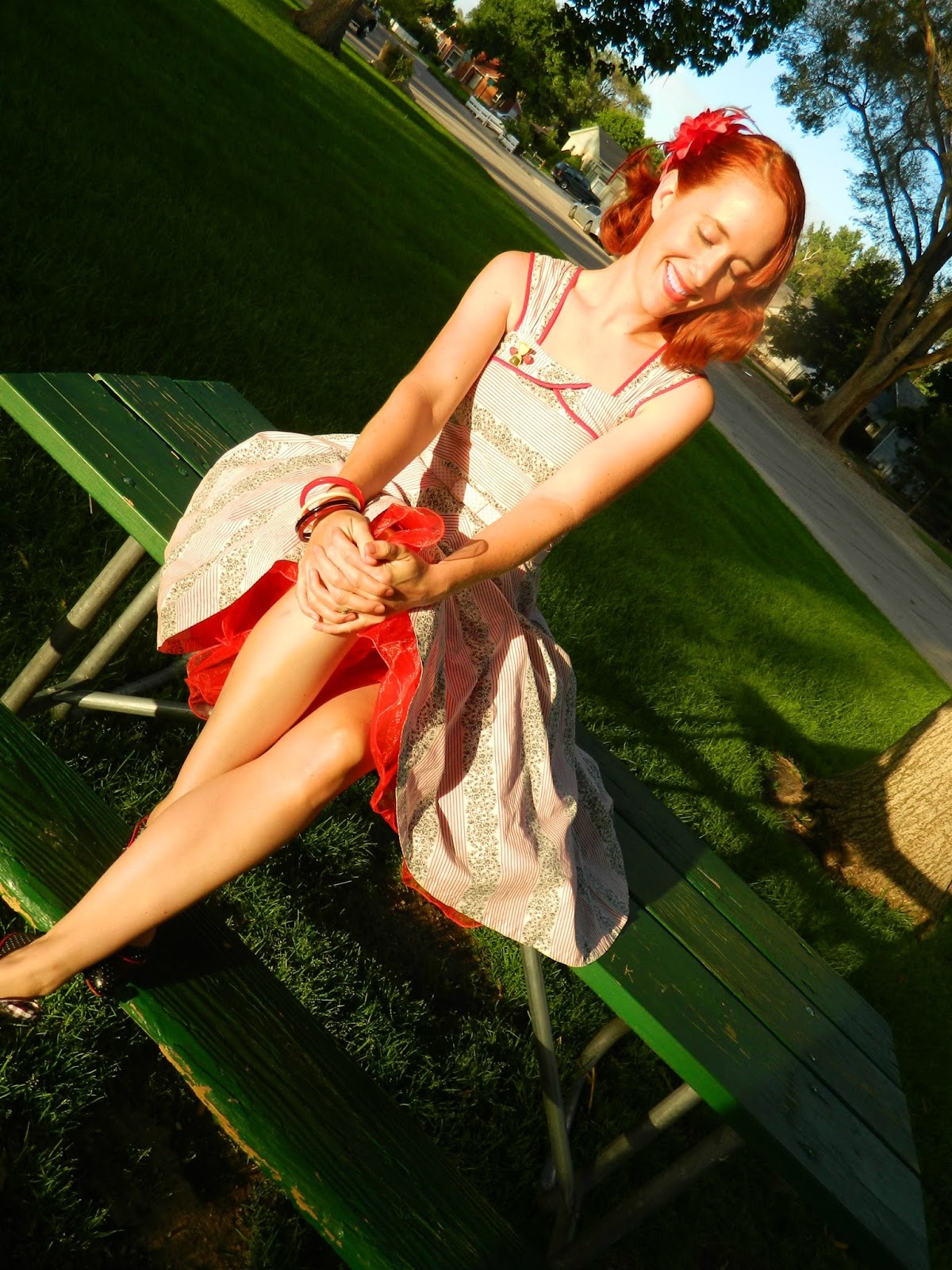 As promised, here is the outfit that I wore to present Pueblo Modern: Inside and Out. It's a fabulous 1940s dress in a gray floral, and red stripe pattern. It actually has a matching bolero, but it was too hot to wear it. The dress was an Etsy purchase, my shoes are Poetic License, and my red crinoline (not vintage) was from eBay. The absolute best part of my outfit is my 1940s plastic novelty brooch. It has two hearts that say, "kiss timer," and a working hour glass that you can flip!! It's my favorite piece of jewelry right now! We stopped by Taffy's to grab some ice cream before heading to a park to snap these shots. A guy walked by, who can best be described as Latino Elvis, and asked me if I just got done with a dance performance. "Nope, this is just me," I replied. He said, "Really? That's how you rock it? Sooo cool!"